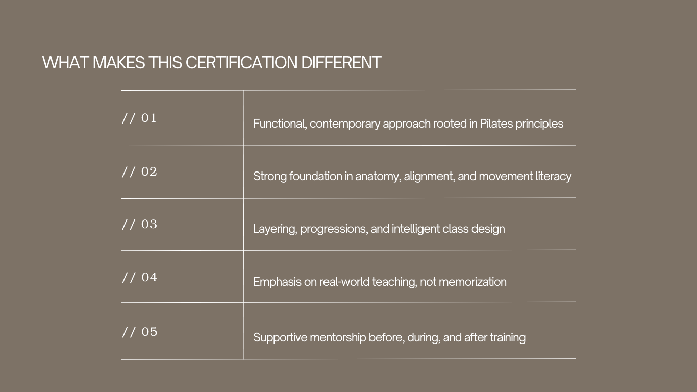 Our certification focuses on why movements work, not just how to cue them - so you leave with confidence, clarity, and the ability to teach diverse bodies safely and effectively.