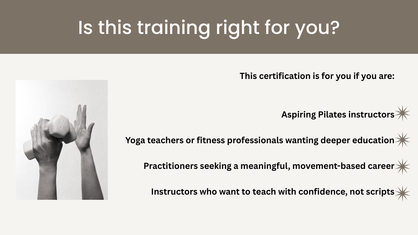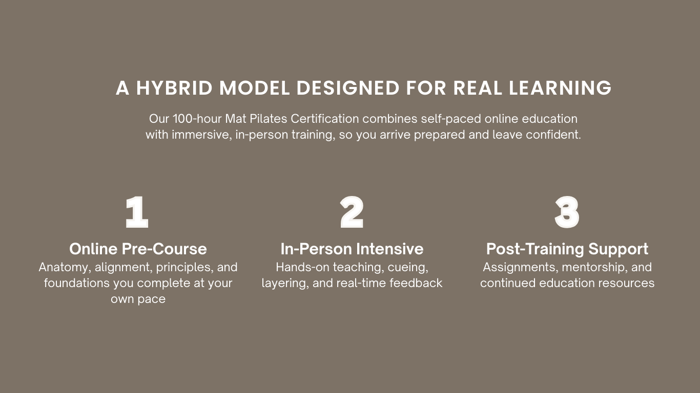The Body Balance Studio offers a 100-hour Mat Pilates Instructor Certification that blends classical Pilates principles with modern biomechanics, intelligent sequencing, and real-world teaching skills.