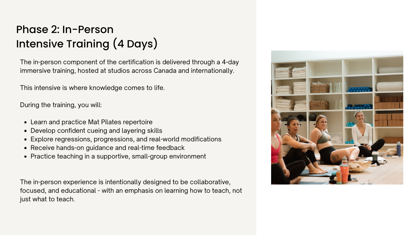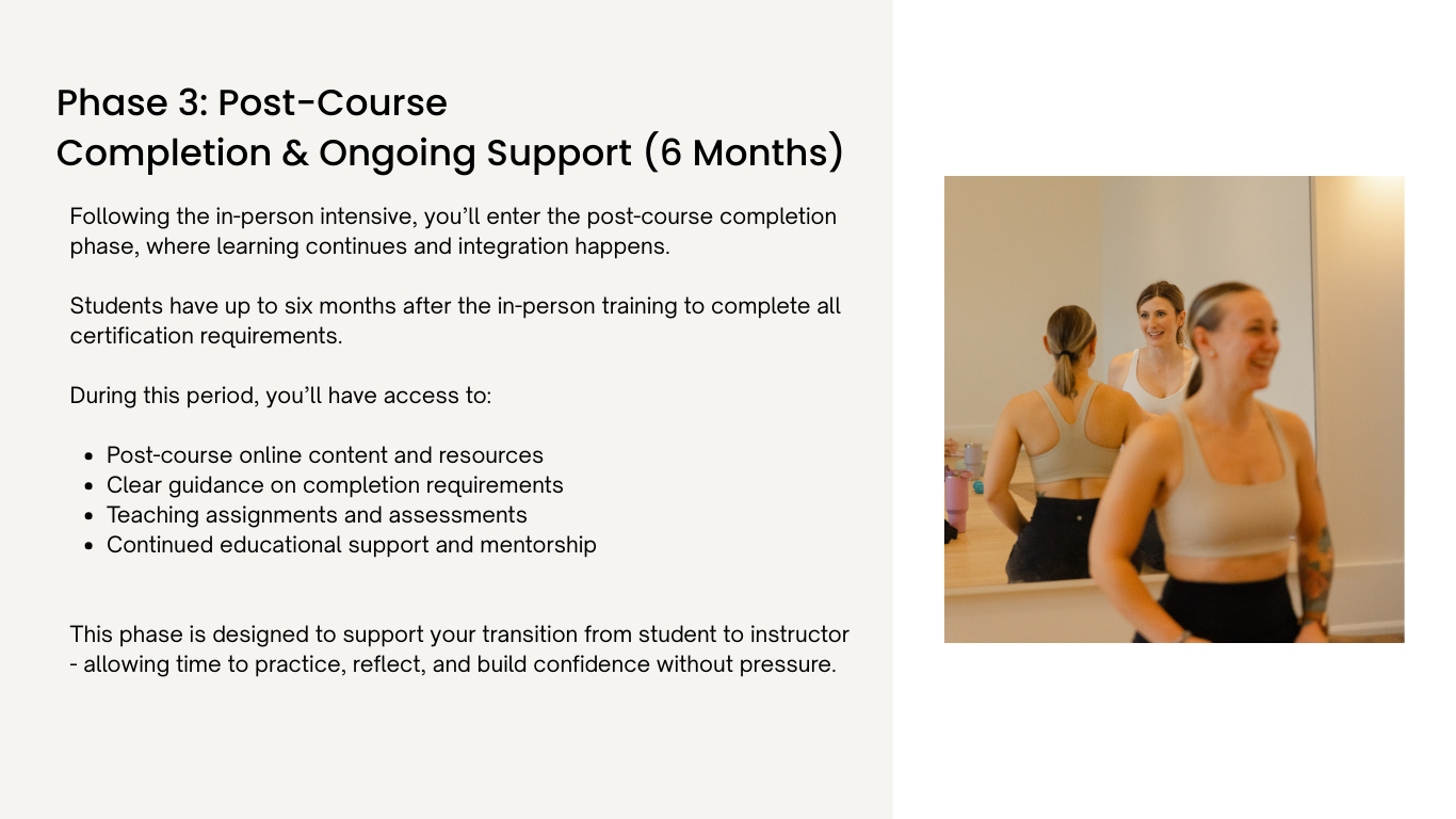 Rather than completing everything in a single weekend, this certification prioritizes education, embodiment, and real-world readiness.