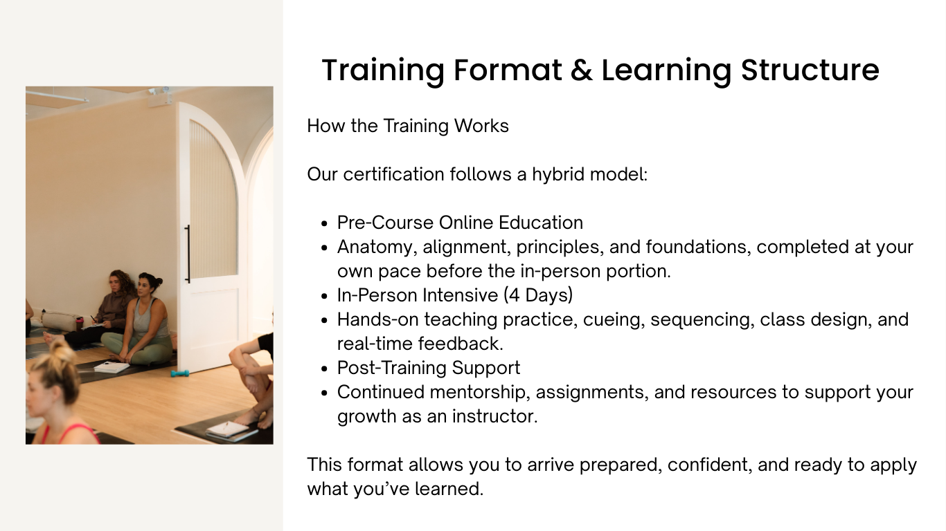 Whether you’re looking to deepen your own practice or step into teaching, these trainings are intentionally kept small to ensure personalized feedback, mentorship, and connection.